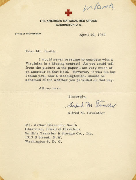 401401 Alfred M. Gruenther Scroll down to see a scan of the item below the description “I would never presume to compete with a Virginian in a kissing contest!” Alfred Maximilian Gruenther, 1899–1983. U.S. Army General; NATO Supreme Commander; President, American National Red Cross. Typed Letter Signed, one page, 6½" x 8½", on stationery of the American National Red Cross, Washington, D.C., April 10, 1957. Gruenther writes a playful letter to Arthur Clarendon Smith: “I would never presume to compete with a Virginian in a kissing contest! As you could tell from the picture in the paper I am very much of an amateur in that field. However, it was fun but I think you, now a Washingtonian, should be ashamed of the weather you provided on that day." During World War II, Gruenther, a brilliant staff officer, was chief of staff of the 3rd Army (1941–1942) before he became deputy chief of staff to General Dwight D. Eisenhower in London (1942–1943), chief of staff of the 5th Army in Italy (1943–1944), and chief of staff of the 15th Army Group under General Mark W. Clark (1944–1945). He served as chief of staff of the Supreme Headquarters Allied Powers Europe (1950–1953) before becoming NATO Supreme Commander (1953–1956). He retired from the Army in 1956, and in 1957 he became president of the American National Red Cross, a post he held until 1964. He also served on various governmental advisory commissions. The letter has normal mailing folds and tape stains across the corners from prior mounting. Smith has noted "In Book" in blue ink at the top of the page, signifying that the letter was to go into his album. Overall the letter is in fine condition. Unframed.