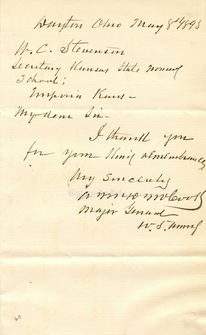 McCook responds to a university professor Alexander McDowell McCook, 1831-1903. Union General, American Civil War. Autographed Letter Signed, A McD McCook, one page, 4¾" x 7¾", with integral leaf attached, Dayton, Ohio, May 8, 1895. The general, writing in the year of his retirement from the United States Army, sends a courtesy reply to W. C. Stevenson. “I thank you,” he writes, "for your kind remembrance." He signs the letter with his rank, “Major General / U. S. Army." This letter comes from a large collection of letters, notes, and signatures assembled by Stevenson, a professor of penmanship at the State Normal School at Emporia, Kansas, now Emporia State University. He had his students write to prominent men and women to request a handwritten letter expressing a reminiscence, a favorite sentiment, or a word of advice. As this letter shows, he also wrote himself to people of note. The highest ranking member of the legendary “Fighting McCooks of Ohio,” fourteen family members who all served in the Civil War, McCook saw action at First Bull Run; Nashville, Tennessee; the Battle of Shiloh and the subsequent Battle of Corinth; the Battle of Stones River; and Chickamauga. He received substantial credit for the Union victory under General Ulysses S. Grant on the second day of the Battle of Shiloh after Grant suffered a bloody loss on the first day. McCookʼs command suffered heavily at Chickamauga, however, and McCook was court-martialed for his role in the defeat, although he was acquitted: The court decided that he may have made a tactical error by ordering his troops from the field of battle but that “his gallant conduct in the engagement forbids the idea that he was influenced by consideration of personal safety." McCook was relieved of command of Army of the Cumberland but was later given command of the defenses around Washington, D.C., and defeated Confederate Jubal A. Earlyʼs troops in two days' battles around Fort Stevens and Fort DeRussy. McCook went on to play a role in defense of the Native American uprisings in the West. He commanded Fort Leavenworth, Kansas, from 1886 to 1890. He became a full brigadier general in 1890 and a major general in 1894. A year after his retirement from the Army in 1895, General and Mrs. McCook represented President Grover Cleveland at the coronation of Russiaʼs Czar Nicholas II. In 1898-1899, McCook served on a commission to investigate the War Departmentʼs conduct of the Spanish-American War. McCook has penned this letter in black fountain pen. The letter is in very fine condition. It has two horizontal mailing folds and mounting traces on the back of the integral leaf, which has been tipped to the front leaf at the upper and lower right corners. There is a small collectorʼs pencil notation in the blank area at the lower left. Unframed. Click here for information about custom framing this piece.