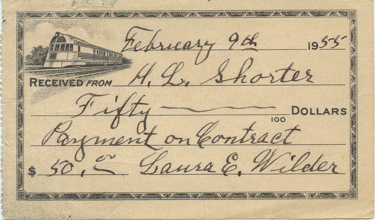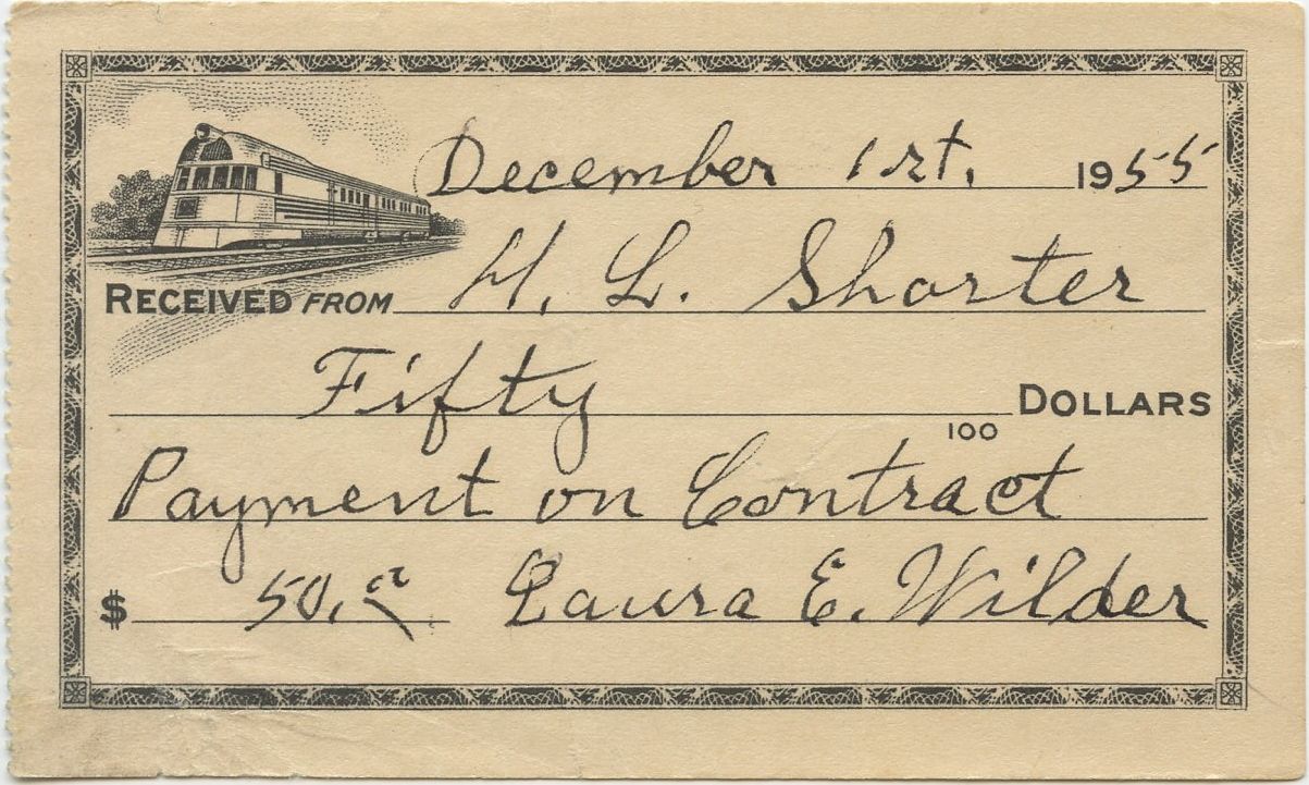 1328010–1328022 Laura Ingalls Wilder Scroll down to see images of the item below the description Receipts written and signed by Laura Ingalls Wilder for payments on the sale of the Wilders’ Rocky Ridge Farm Laura Elizabeth Ingalls Wilder, 1867–1957. Renowned American children’s author. Partially printed Autograph Documents Signed, with rare forms of her signatures, Laura E. Wilder and L. E. Wilder, various dates 1949–1956. These handwritten receipts evidence the neighbors’ monthly payments on the purchase of the Wilders’ farm and home outside of Mansfield, Missouri. In three separate transactions in 1943 and 1948, Laura and Almanzo Wilder sold their Rocky Ridge Farm, where Laura wrote all of the Little House books, to their neighbors, H. L. and Gireda Shorter. The Wilders reserved the right to live in the house on the property and use the outbuildings until their deaths. They gave the Shorters these dime store receipts acknowledging their $50 payments on the purchase contracts. Almanzo wrote and signed the receipts until a few months before he died, when Laura began writing and signing them. It was in the Rock House on the property, a new home that the Wilders’ daughter Rose built for them in 1928, that Laura wrote the first four of the Little House books: Little House in the Big Woods (1932); Farmer Boy (1933); Little House on the Prairie (1935); and On the Banks of Plum Creek (1937). After Rose moved away from Mansfield for good in 1935, the Wilders moved back into their beloved old farmhouse. Laura wrote the rest of the Little House books there: By the Shores of Silver Lake (1939); The Long Winter (1940); Little Town on the Prairie (1941); These Happy Golden Years (1943); and, published posthumously, The First Four Years (1971). These receipts span the period from March 8, 1949, to May 1, 1956. Laura has datelined most of them at “Mansfield, Mo.” All are for $50, and she has noted “Payment on Contract” on each. These receipts are in fine to very fine condition. Laura has written and signed them in either pencil or ink. Of those written in ink, one is in blue ballpoint pen, and the others are in black fountain pen. The receipts written in pencil, which have an image of a sailing ship at left, are approximately 2⅜” x 6”. Those written in ink, which have an image of as vintage passenger train at the upper left, are approximately 2⅜” x 4”. The conditions vary somewhat, with flattened creases, handling marks, and some imperfections in the printing (on some, the printing is not centered on the piece and the paper is not exactly square). One, the receipt dated May 1, 1956, has light pencil notes in another hand on the back. Each piece has perforations at the left edge from where it was removed from the receipt book. The scans below accurately illustrate the conditions of the pieces except that the perforations do not show in all of the scans. We will sell these receipts either individually or as a set, as noted. There is a price break for the entire set. It would be most efficient to call us to purchase one or more of these. To use the red link below to order online, please specify which of the pieces you want. While we make every effort to keep our website current, the particular receipts are, naturally, subject to prior sale. Unframed. |