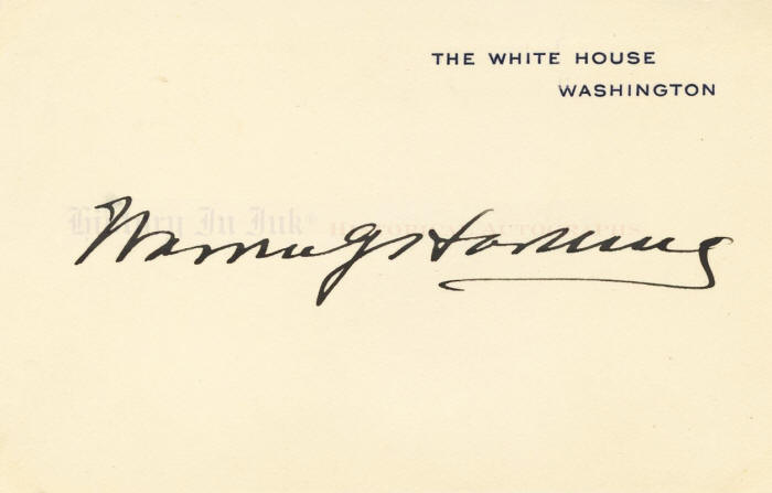 Magnificent The White House card with jet black Harding signature Warren Gamaliel Harding, 1865-1923. 29th President of the United States. Very fine condition 2¾" x 4¼" The White House card, boldly signed Warren G. Harding. This is an exceptional example of one of President Hardingʼs signed The White House cards. The surface still shows most of its original sheen, and it has never been mounted. One could look for years without finding a card this nice. Harding served as President less than 2½ years before his untimely, unexpected death on August 2, 1923. Thus, his signed The White House cards “were never common,” and they "have become somewhat scarce in recent years." Lynne E. Keyes & Stephen Koschal, The History of Collecting Executive Mansion, White House, and The White House Cards 56 (2d ed. 2006). Harding, an Ohio Republican, was a newspaper publisher turned politician. He served in the Ohio Senate and later as Ohio's Lieutenant Governor. He was elected to the United States Senate in 1914. Six years later, when the Republican convention deadlocked, party leaders meeting at the Blackstone Hotel in Chicago picked the dark horse Harding as the at the end of his term, he was elected President of the United States. Harding's pledge of a “Return to Normalcy" appealed to Americans tired of the preoccupation with World War I and its aftermath. Harding, who like William McKinley waged the campaign from his front porch in Marion, Ohio, rode into the White House on a landslide victory. Harding and Calvin Coolidge defeated their Democratic opponents, Ohio Governor James M. Cox and Assistant Secretary of the Navy Franklin D. Roosevelt, by margins of 60%-34% in the popular vote and 404-127 in the electoral vote. Harding's cabinet included luminaries such as Secretary of State Charles Evans Hughes, a former Supreme Court justice and Republican presidential nominee who would later serve as Chief Justice of the United States; Secretary of the Treasury Andrew Mellon; and Secretary of Commerce Herbert Hoover, who would later be elected President of the United States himself. But Harding also surrounded himself with others who proved unworthy of his trust. Administration officials were convicted of accepting bribes and other illegal activities. The most prominent was Secretary of the Interior Albert B. Fall, who was convicted of leasing public oil reserves to business associates in exchange for bribes and illegal no-interest loans in a scandal that became known as the “Teapot Dome Scandal." It is unclear whether Harding himself knew of the wrongdoing. Harding did not survive his elected term. He died in San Francisco after becoming ill on a West Coast trip, and Coolidge succeeded him. This card is virtually pristine. Under magnification, one can see slight brushing across two of the letters of the engraved printing, and there are a couple of scattered spots, one of which is under the beginning stroke of the “W" in Hardingʼs first name. They are insignificant, and we mention them for completeness. This card would be beautiful in a framed display. Unframed. Please click here for information about custom framing this piece.