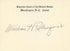 1619717 William H. Rehnquist Scroll down to see images of the item below the description Virtually pristine Supreme Court card signed by the second-longest serving Chief Justice William Hubbs Rehnquist, 1924–2005. Chief Justice of the United States, 1986–2005; Associate Justice, Supreme Court of the United States, 1972–1986. 3⅜” x 4½” Supreme Court card, boldly signed William H. Rehnquist. With original unaddressed envelope. This is a beautiful card that Rehnquist has signed in black ballpoint pen. The signature is 3¾” long. President Richard Nixon appointed Rehnquist, then an Assistant Attorney General, to the Supreme Court in 1971 to fill the vacancy created by the retirement of Justice John Marshall Harlan. Rehnquist had served as the law clerk to Justice Robert H. Jackson during the 1952–1953 term following his graduation at the top of his class at Stanford University Law School. He then practiced law in Arizona but returned to Washington to join the Justice Department, as the top lawyer to Attorney General John Mitchell, when Nixon took office. Nixon nominated him for a seat on the Supreme Court along with Lewis F. Powell, Jr., whom he nominated to fill the concurrent vacancy created by the retirement of Justice Hugo L. Black. The Senate confirmed Rehnquistʼs appointment by a 68–26 vote on December 10, 1971, and Rehnquist took his seat as the junior Justice—Powell was confirmed first—on January 7, 1972. In 1986, when Chief Justice Warren E. Burger retired, President Ronald Reagan nominated the gregarious Rehnquist to be Chief Justice. The Senate confirmed him by a similar vote, 65–33, and he became the nationʼs sixteenth Chief Justice. He served until his death in 2005. Rehnquist was a staunch conservative. He dissented in Roe v. Wade, 410 U.S. 113 (1973), in which the Supreme Court held that the right to privacy includes the right of a woman to obtain an abortion under certain circumstances. Rehnquistʼs view of federalism favored state power—applying the Tenth Amendment, which reserves to the states the powers not specifically conferred on the federal government. Rehnquist wrote the decision in United States v. Lopez, 514 U.S. 549 (1995), in which the Court, for the first time since the New Deal, invalided an a federal law on the ground that Congress had exceeded its power under the Commerce Clause of the Constitution. In 1999, Rehnquist became only the second Chief Justice to preside over a presidential impeachment trial—a task that the Constitution confers on the Chief Justice—when he presided over the trial of President Bill Clinton. All together, Rehnquist served on the Supreme Court more than 33 years, the eighth longest serving Justice in American History. The last 19 years, he served as Chief Justice, the second longest term in history behind that of Chief Justice John Marshall. This card is bright and in very fine condition. Only a faint mark in the blank area above Rehnquistʼs last name keeps us from grading the card extra fine. It comes with the original engraved Supreme Court envelope, which has never been sealed and is in extra fine condition. Unframed. Click here for information about custom framing this piece. This piece is now part of a larger set of Supreme Court cards of the entire Burger Court. Click here to inquire about that set. |