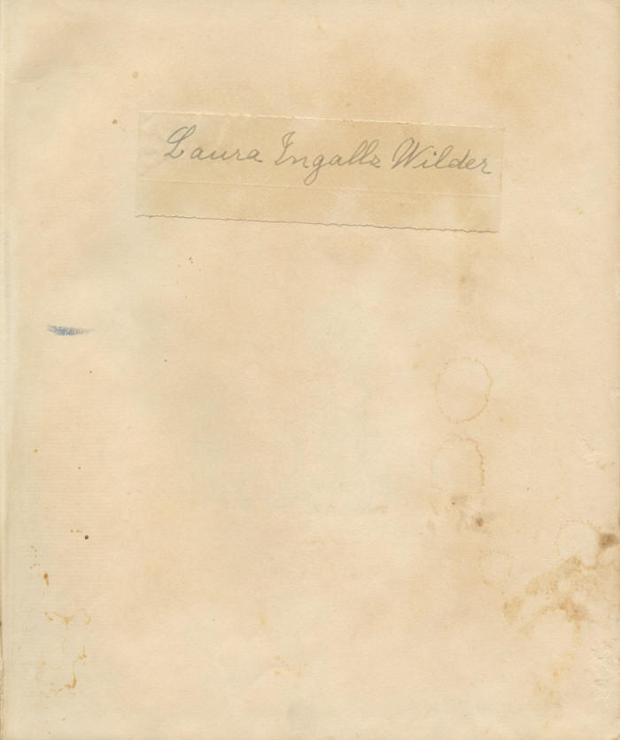 1801802 Laura Ingalls Wilder Scroll down to see images of the item below the description 1952 copy of Farmer Boy, chronicling a year in the childhood of Almanzo Wilder, with Laura Ingalls Wilder’s signature tipped in Laura Elizabeth Ingalls Wilder, 1867–1957. American author. Wilder’s book Farmer Boy with her signature, Laura Ingalls Wilder. This is a nice alternative to a signed copy of Farmer Boy. Wilder’s signature on a small piece of paper has been tipped to the front free endpaper. Farmer Boy, Wilder’s second book, was first published in 1933, the year after her first book, Little House in the Big Woods. While Little House in the Big Woods begins the story of the childhood of Laura Ingalls, Farmer Boy tells of the childhood of her future husband, Almanzo Wilder (1857–1949), on a farm near Malone, New York, just south of the Canadian border. Farmer Boy is set in 1866–1867 and spans about a year just before Almanzo’s tenth birthday and shortly before Laura’s birth. Laura met Almanzo at De Smet, South Dakota, where she lived with her parents after her father took a job with the railroad, and where Almazo had moved to homestead land after migrating from New York to Minnesota. Almanzo was 25 years years old and she was 15 when they began their courtship. They were married in De Smet in 1885. This cloth-bound book, published by Harper & Brothers, is the 1952 reproduction of the 1933 original illustrated by Helen Sewell, the earliest illustrator of Wilder’s books. There is one color illustration plate near the front of the book. Beginning in 1953, the drawings were replaced with those by Garth Williams. Wilder’s Little House books are timeless and enduring. Wilder wrote of late 19th Century pioneer life in Wisconsin, Kansas, Minnesota, and South Dakota. Altogether there were nine Little House books, which she wrote about 50 miles from us at the Rocky Ridge Farm at Mansfield, Missouri: Little House in the Big Woods (1932); Farmer Boy (1933); Little House on the Prairie (1935); On the Banks of Plum Creek (1937); By the Shores of Silver Lake (1939); The Long Winter (1940); Little Town on the Prairie (1941); These Happy Golden Years (1943); and, published posthumously, The First Four Years (1971). The series is as popular today as it was three generations ago. The books have remained in continuous publication since the appearance of Little House in the Big Woods and have been translated into more than 40 languages. Most of the sites that Wilder described in the books are now museums that annually draw thousands of visitors. The cloth cover of this book is is worn, which shows how frequently the book was read. Inside the pages are generally clean, although the front free endpaper on which Wilder’s signature appears has some toning and stains, we see a couple of light marks in the margin on one page, and a vertical tear in the upper left corner of the title page has been repaired. A child has written his name at the bottom of the last page and has made a mark on the inside of the back cover. There is a 1½” separation at the bottom of the inside of the front cover, but overall the binding is tight. Wilder’s large signature, in gray fountain pen, is 3¾” long. The paper on which she has signed is a tad bit rippled, but the signature is in fine condition. We have offered more signed copies of Wilder’s Little House books than anyone else, to our knowledge, and in our experience true signed copies of her books are rare and expensive in any condition. This book, with her signature tipped in, is a nice alternative to a true signed copy of Farmer Boy.