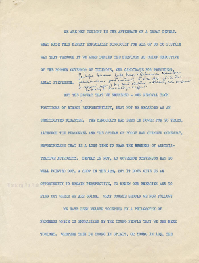 1802202 John F. Kennedy Scroll down to see images of the item below the description Heavily hand-corrected pages from JFKʼs reading copy of a 1953 speech, early evidence of his effort to make himself known nationwide and position himself to seek the White House John Fitzgerald Kennedy, 1917–1963. 35th President of the United States, 1961–1963. Typed speech reading copy, with autograph annotations by Kennedy, three pages, 8” x 10½”, [Wilmington, Delaware, May 14, 1953]. This is a choice relic from the beginnings of Kennedyʼs serious effort to spread himself beyond Massachusetts, establish a nationwide political presence, and position himself to seek the White House. These are the first three pages of his reading copy of his speech to the Jefferson-Jackson Day Dinner at the Hotel Dupont in Wilmington, Delaware, on May 14, 1953. Kennedy has annotated each of these three pages in blue ballpoint pen. Kennedy was nothing if not politically ambitious. After serving six years in the United States House of Representatives, he challenged and defeated incumbent Massachusetts Senator Henry Cabot Lodge, Jr., in 1952. A Democrat, the youthful and charismatic Kennedy defeated an entrenched Republican in what was otherwise a Republican landslide with Dwight D. Eisenhower at the head of the ticket. After his election to the Senate, Kennedy immediately began to range beyond Massachusetts, making himself known in other areas of the country and laying the groundwork for a future presidential bid. In 1953 alone, the freshman Senator spoke in Connecticut, the District of Columbia, Indiana, Maryland, New York, Rhode Island, Tennessee, and, in this speech, Delaware. He spoke more and more around the country in the following years and gathered even greater nationwide appeal by delivering the high-profile speech to nominate Adlai Stevenson for President at the 1956 Democratic convention. His loss of a tight, three-ballot race for the vice presidential nomination was likely a blessing rather than a curse: Going down to sure defeat as Stevenson’s running mate—the popular Dwight D. Eisenhower carried 42 states, including Kennedy’s home state of Massachusetts—could well have damaged Kennedy’s political future. The Kennedy Library archives contain two typed versions of this speech. One, a nine-page, double-spaced version, is virtually identical to this one in the first three pages. The only differences appear to be two words, one noted in a handwritten change on the Kennedy Libraryʼs copy that appears in type in this one, and the other inserted into this one in type at some point. The other Kennedy Library version is the three-page, single-spaced advance copy that presumably was distributed to the press. As these pages show, Kennedy continued to make changes in his speech right up to the time that he delivered it. The “redaction of this speech made for the convenience of readers and researchers” on the Kennedy Library website, which the Library says “is based on the Reading Copy of the speech,” does not contain the changes that Kennedy has made here by hand. One can almost hear Kennedy beginning the speech by recognizing that the Republicans took control of the White House, the House of Representatives, and, with Vice President Richard Nixon to break a tie vote, the Senate as well. “We are met tonight in the aftermath of a great defeat,” he said. “What made this defeat especially difficult for all of us to sustain was that through it we were denied the services as Chief Executive of the former Governor of Illinois, our candidate for President, Adlai Stevenson.” By hand, he has added: “Perhaps because both Mass[achusetts] & Delaware were once beachheads on a great continent, it is in these states that he secured some of his most devoted adherents, who responded naturally to his challenge & appeal.” On the second page, Kennedy has added a marginal note, “Will Rogers,” with a star to mark where he evidently intended to insert a humorous comment between two sentences before deriding what he saw as Republican disarray: “All of our associates may not belong to quite the same organization. * But the organization of the Democratic Party in the minority with all of its conflicting groups, is a model of consistency and uniformity when compared with our Republican friends in Washington.” On the third page, he has written “* Bipartisan” at the top, following the end of a sentence starting on the previous page: “Indeed, I expect to hear any day that the President can muster a majority in the Senate—all he needs is two more Democratic seats. * Bipartisan.” Kennedy also moved the words “in the House” from one place to another to correct the syntax, and he has stricken the last part of the first full paragraph in which he originally intended to complain that the Republicans intended “to turn over the billions and billions of dollars of tidelands oil resources belonging to all the people to a few.” The text reproduced on the JFK Library website does not show that Kennedy deleted that part from the speech. The Kennedy Libraryʼs double-spaced copy of this speech is nine pages long. Unfortunately, we have no information about the remaining six pages of Kennedyʼs actual reading copy. Perhaps these three pages were saved because they bear Kennedyʼs handwritten edits. These pages are in very fine condition. They all have a diagonal fold in the upper left corner, no doubt from where Kennedy himself folded them as he worked through the speech and then spoke from this final draft, and staple holes from where they were originally bound together. There are a few other minor handling marks, but nothing significant. Unframed. Click here to see other Presidents and First Ladies autographs. |