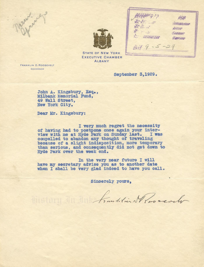 F.D.R. sends his regrets at having to postpone a meeting with famed social work leader John Adams Kingsbury because of “a slight indisposition, more temporary than serious” Franklin Delano Roosevelt, 1882–1945. 32nd President of the United States, 1933–1945. Typed Letter Signed, Franklin D. Roosevelt, one page, 8” x 10½”, on gold embossed stationery of the State of New York, Executive Chamber, Albany, [New York], September 3, 1929. The first-year Governor sends his regrets for having to cancel a meeting with famed New York social work leader John Adams Kingsbury. He writes, in full: “I very much regret the necessity of having had to postpone once again your interview with me at Hyde Park on Sunday last. I was compelled to abandon any thought of traveling because of a slight indisposition, more temporary than serious, and consequently did not get down to Hyde Park over the week end. / In the very near future I will have my secretary advise you as to another date when I shall be very glad indeed to have you call. / Sincerely yours, . . . .” Kingsbury (1876–1956) was one of the most renowned social work leaders in the United States in the early 20th Century. He served as the director of the prestigious New York City Association for Improving the Condition of the Poor, after which he became the city’s Commissioner of Public Charities, which was the most important public welfare position in the country. Kingsbury later served as a member of the executive committee of the New York State Charities Aid Association and as the secretary and a director of the Milbank Foundation, a health research agency. Roosevelt has signed this letter with a 3¾” full signature in black ink. The letter has two horizontal mailing folds, not affecting the signature. There is a recipient’s stamp in the blank area at the upper right, and there is a pencil notation “Warm Springs” in another hand in the blank upper left margin. Overall the letter is in fine condition. Unframed. This item has been sold. Click here to see our large selection of Presidential items. |