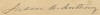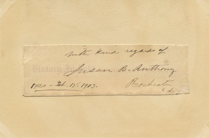 1923604 Susan B. Anthony Scroll down to see images of the item below the description Signature of Anthony, dated in her hand Susan Brownell Anthony, 1820–1906. Women’s rights activist. Autograph Sentiment Signed, Susan B. Anthony, affixed to a card. This is a nice signature of Anthony clipped from a larger piece. She has written “With kind regards of / Susan B. Anthony / Rochester / N.Y.” and has added the dates of her lifetime, “1820–Feb. 15, 1903.” The piece is irregularly clipped from an album page and mounted to 4½” x 3” card. It is uniformly toned and slightly soiled. There is a small foxing spot above Anthony’s last name. Overall, the piece is in fine condition. Unframed. This item has been sold. |