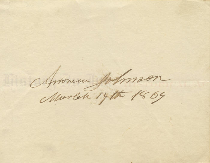 1927802 Andrew Johnson Scroll down to see images of the item below the description Album page signed by Andrew Johnson ten days after leaving the presidency Andrew Johnson, 1808–1875. 17th President of the United States. Signature, Andrew Johnson, dated March 14, 1869, in Johnson’s hand. Johnson signed and dated this 3½” x 4¾” album page ten days after he left the White House upon the inauguration of Ulysses S. Grant on March 4, 1869. He has signed and written the date in brown steel nib pen. There is a bit of brushing to the signature and the date, probably by Johnson himself. A flattened horizontal fold touches the bottom of Johnson’s signature. The paper is irregularly trimmed at the bottom, and the left edge is irregular from where the page has been torn out of an album. Overall, the piece is in fine condition and is perfect for framing. It comes with a vintage 8½” x 11” steel engraving of Johnson, with a facsimile signature at the bottom, made from a photo by framed photographer Mathew Brady. Unframed. Click here to ask us about custom framing this piece. This item has been sold. |