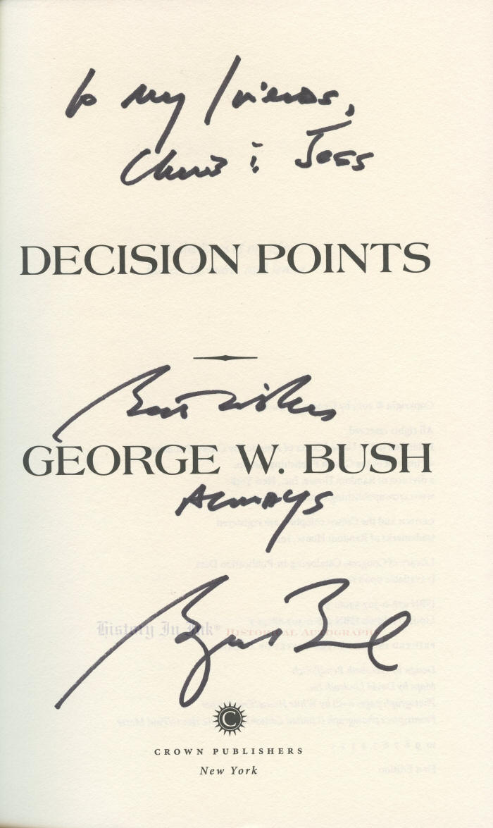 2215601 George W. Bush Scroll down to see images of the item below the description Nearly pristine inscribed and signed first edition, first printing copy of Bush’s memoir, Decision Points George Walker Bush, 1946–. 43rd President of the United States, 2001–2009. First edition, first printing copy of Decision Points, boldly inscribed and signed George W. Bush. This is a stated first edition copy of Bush’s memoir, Decision Points, which was published in 2010. The number line on the copyright page shows that it is also from the first printing. Bush has boldly inscribed and signed it on the title page To my friends, / Chris & Jess / Best wishes / Always / George W. Bush. Bush writes in the introduction that he “decided not to write an exhaustive account of my life or presidency” but instead has “told the story of my time in the White House by focusing on the most important part of the job: making decisions.” Thus, he organized the book so that each chapter deals with a major decision or a series of related decisions. The notes inside the dust cover explain that the book “brings readers inside the Texas governor’s mansion on the night of the 2000 election, aboard Air Force One during the harrowing hours after the attacks of September 11, 2001, into the Situation Room moments before the start of the war in Iraq, and behind the scenes at the White House for many other historic presidential decisions.” This is a beautiful book in fine condition. Bush has signed in black felt tip pen. Only an erased penciled mark in the upper right corner of the half title page and a tiny bend on a corner of the dust cover, neither of which is particularly noticeable, keep it from being very fine.