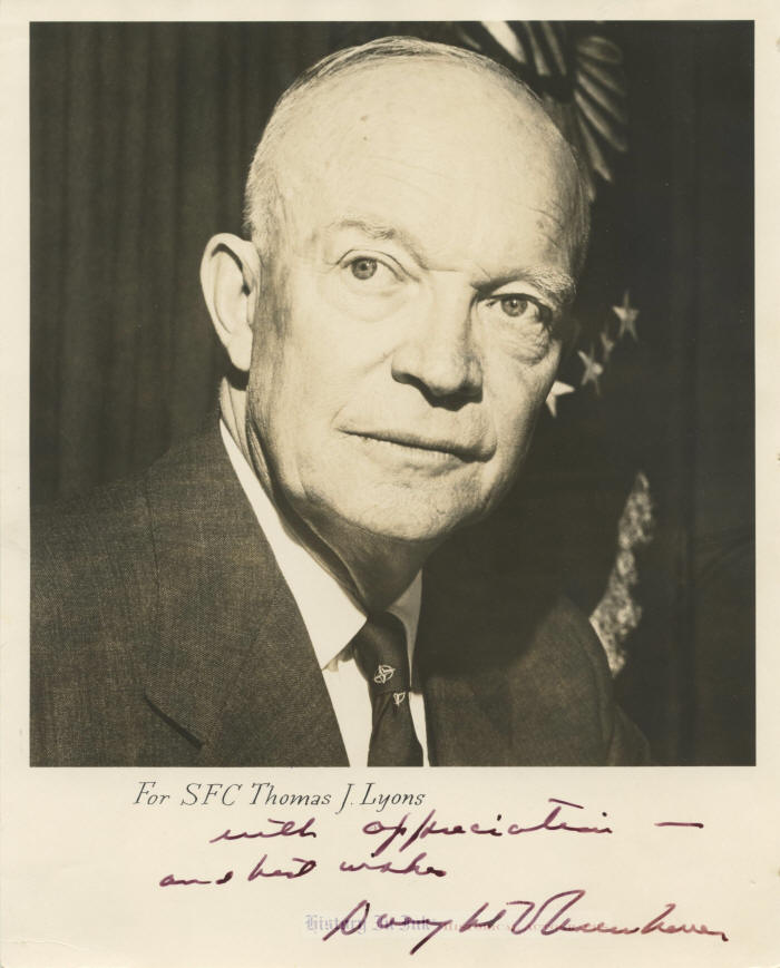 2410101 Dwight D. Eisenhower Scroll down to see the image of the item below the description Photo signed as President to the Ward Master at Walter Reed General Hospital following Eisenhower’s urgent abdominal surgery Dwight David Eisenhower, 1890–1969. General of the Army; Supreme Commander, Allied Expeditionary Force, World War II; 34th President of the United States, 1953–1961. 8” x 10” black-and-white portrait photograph inscribed and signed, Dwight D. Eisenhower. This formal presidential portrait of Eisenhower was taken by George Tames, the New York Times’ renowned White House photographer. It is a bust photo of Eisenhower with the presidential flag displayed behind him. Eisenhower has inscribed and signed the photo for Walter Reed General Hospital Sergeant First Class Thomas J. Lyons, the Ward Master on Ward 8, where Eisenhower was hospitalized for more than three weeks after urgent abdominal surgery at Walter Reed in June 1956. Click here to see the letter, which we are offering separately, that Eisenhower wrote to Lyons to thank him for his work. Nine months after suffering a heart attack, Eisenhower developed an acute intestinal obstruction that resulted in the surgery. Shortly after midnight on June 8, 1956, the President had severe pain in his lower abdomen. His personal physician saw him at the White House and gave him two tap water enemas, but the pain gradually increased, and his abdomen became moderately distended. He vomited 1½ quarts of bile-stained fluid, and his blood pressure dropped. The Chief of Medicine at Walter Reed, who was summoned as a consultant, found the 65-year-old President “shock-like.” He was “listless, apathetic, perspiring freely, with his skin somewhat cool and clammy and with his normal ruddy color absent.” Once it was safe to move him, doctors took him by ambulance to Walter Reed, where he was seen by four surgical consultants. After testing, they determined that Eisenhower had a small bowel obstruction secondary to regional enteritis. At 1 a.m. on June 9, with Eisenhower’s abdomen showing more marked distention, and with the obstruction “apparently increasing in spite of the correct application of nonsurgical measures,” the doctors unanimously agreed that the President needed surgery. The question was whether to perform the surgery immediately or wait to see whether the obstruction would pass. After some debate, the doctors unanimously decided to perform the surgery while Eisenhower was still in good enough condition rather than wait until his condition deteriorated to the point that they would be forced to do it. The surgery began at 2:57 a.m. and took almost two hours. It “was carried out without incident of any kind,” and Eisenhower’s condition “at no time gave rise to any anxiety.” A full account of Eisenhower’s illness, surgery, and recovery, from which this information and these quotations come, appears in Lt. Gen. Leonard D. Heaton, et al., President Eisenhower’s Operation for Regional Enteritis: A Footnote to History, 159 Annals of Surgery 661 (1964). Eisenhower spent 22 days at Walter Reed until he was discharged on June 30, 1956. He continued to recuperate at his farm in Gettysburg, Pennsylvania. Eisenhower’s hospitalization and the urgency of his surgery were important events during the summer of 1956, since Eisenhower was running for reelection as President. Given his popularity, the Democrats did not make his his health as big an issue as they could have, particularly since this surgery followed his heart attack nine months before that left him hospitalized for some seven weeks. They campaigned on the issue indirectly, however, by pointing to Vice President Richard Nixon and arguing that it would be dangerous to elect a candidate who might not survive his four-year term. Democratic nominee Adlai Stevenson expressly warned that Americans had “the solemn obligation to consider with utmost care who will be their president if the elected president is prevented by a higher will from serving his full term.” The 56-year-old Stevenson toured all parts of the country to showcase his good health while Eisenhower largely stayed off the campaign trail. But the travel wore Stevenson down, and by election day Eisenhower, who made only seven major campaign speeches, appeared to be the healthier of the two. Eisenhower easily won reelection, beating Stevenson by a bigger margin in 1956 than he had in 1952. Eisenhower received 57.4% of the popular vote and won 457–73 in the electoral vote in 1956, which bested his 55.2% of the popular vote and his 442–89 win in the electoral vote in 1952. This is a nice photograph of Eisenhower. It bears a calligraphic inscription to Sergeant First Class Lyons, but Eisenhower has added by hand “with appreciation — and best wishes” and has signed it with a huge 4¼” signature in black fountain pen. Information on the back of the photo shows that Tames took the photo in April 1956. The photo bears a New York Times copyright notice and a note that it was reproduced by the Army Photographic Agency at The Pentagon. There is light rippling at the top and bottom edges, and there are tape stains at the top and bottom on the back that do not bleed through to the front. The photo is in fine condition. This photo has an excellent association to Eisenhower’s serious illness and hospitalization in 1956. It is a nice piece for any Eisenhower or presidential collection. Unframed. This item has been sold. |