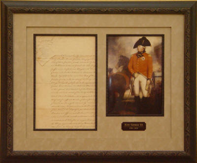 George William Frederick, 1738-1820. King of Great Britain and Ireland, 1760-1820; nominally King of France, 1760-1801; King of Hanover, 1814-1820. Manuscript Document Signed, George R, two pages (recto and verso), 9½" x 14", Court of St. James's, May 26, 1768. In this document, the King authorizes a general court martial to try and sentence a Private Grenadier in the Troop of House Grenadier Guards for disobedience of orders and insolent behavior behavior toward a lieutenant. George III has signed this document with a large 2½" signature. The paper and wax seal is intact. The document is double matted in tan suede with an inlaid brown wood fillet, a portrait of George III, and an engraved identification plate and is framed in an ornate brown wood frame. _____________