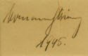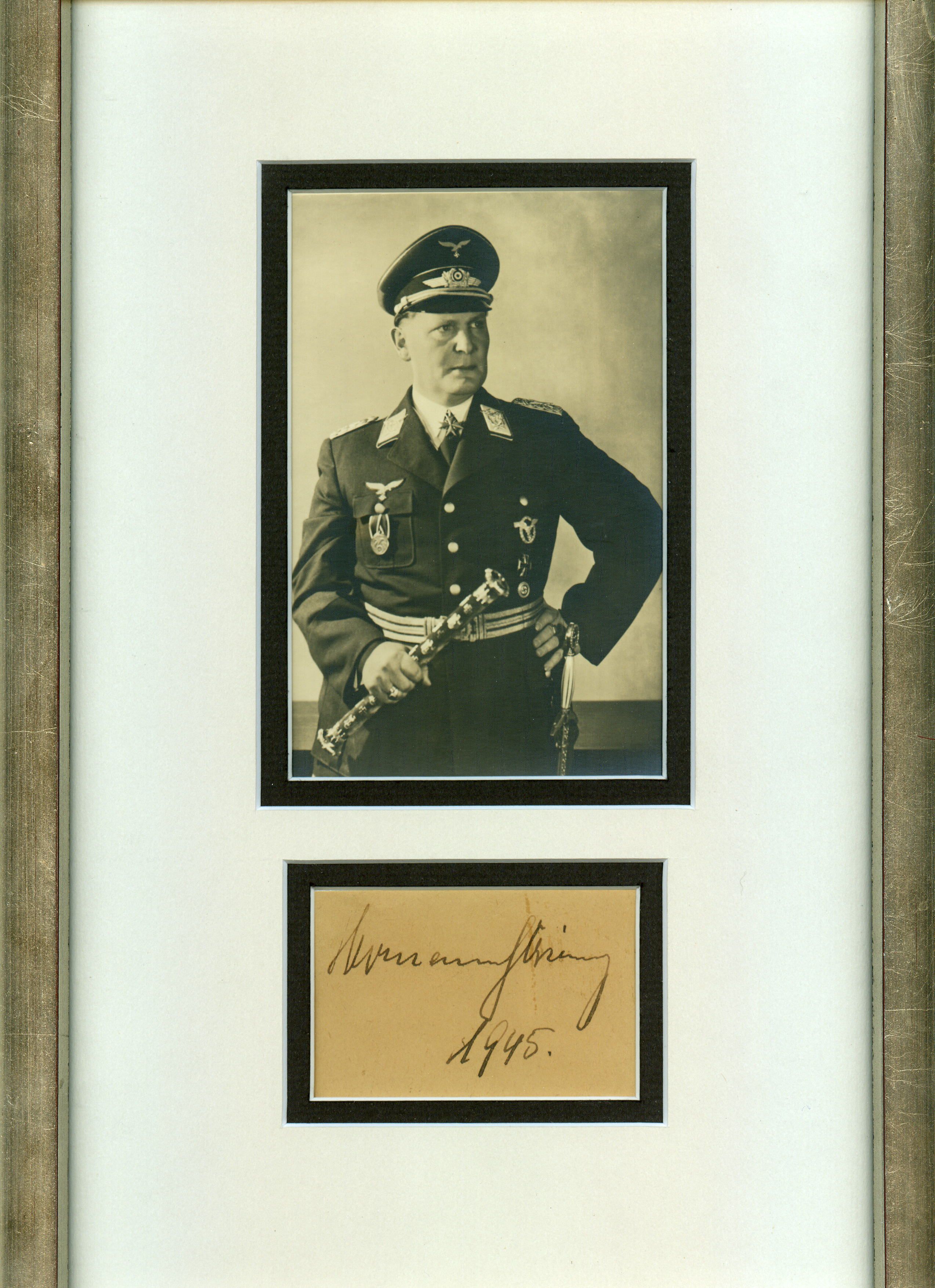 Hermann Wilhelm Göring, 1893-1946. Nazi Reichsmarshall; Luftwaffe commander-in-chief. Brown ink signature dated by Göring, Hermann Göring 1945, framed with a portrait. This is a nice, full signature of Göring dated the year World War II ended. Göring commanded the Luftwaffe and became second in Nazi Germany to only Adolf Hitler himself. The Allies captured him on May 9, 1945, the day after Germany surrendered. He was imprisoned in Nuremburg, where he was tried for and convicted of war crimes and crimes against humanity. The international military tribunal sentenced him to be hanged, but he escaped execution by committing suicide on October 15, 1946, shortly before the Allies could carry out the sentence, by ingesting cyanide from a vial that he had managed to hide. This signature is on a brown card or slip of paper measuring approximately 2" x 3¼". A small stain affects the first two letters of Göring's last name. The signature is handsomely double matted in black and white with a portrait photograph of Göring with his marshal's baton and is framed in a silver wood frame to an overall size of 9¼" x 14¼". We have not examined the signature out of the frame, but it appears to be in fine condition.