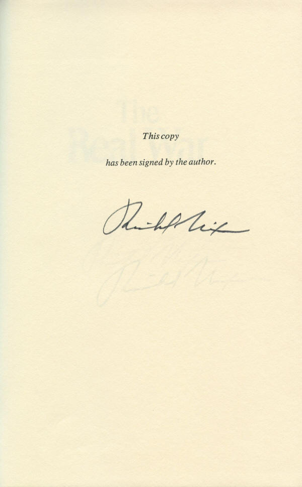 Richard Milhous Nixon, 1913-1994. 37th President of the United States. Mint condition special Warner Books edition of Nixon's book The Real War, signed Richard Nixon. This is the first printing of the Warner Books edition of The Real War. This beautiful maroon cloth-covered edition is embossed in silver on the cover and spine and gilded silver on the page edges. The endpapers are imprinted with maps of the eastern and western hemispheres. Nixon has signed it on the limitation page before the half title page. Nixon's signature is bold and black. Interestingly, beneath his signature are the light imprints of two other Nixon signatures that likely transferred when Nixon was signing other pages for binding into copies of this book. So this book actually bears what could be described as three Nixon signatures, not one. This book is interesting, but all the more so with the hindsight of 30 years after Nixon wrote it. Nixon decries Soviet expansionism, the push toward Communist domination that Nixon described as World War III. That war, he said, began before World War II ended and had “proceeded from the Soviet seizure of Eastern Europe, through the communist conquest of China, the wars in Korea and Indochina, and the establishment of a western hemisphere outpost of Soviet power in Cuba, to the present thrusts by the Soviet Union and its allies into Africa, the Islamic crescent," in countries such as Afghanistan and Iran, “and Central America." It was, he said, a "total war . . . waged on all levels of life and society,” one that involved, among other things, military and economic power, willpower, and “the strength of a nation's galvanizing ideas and the clarity of its sense of purpose.” This book is in absolutely mint condition. It comes with the matching slipcase.